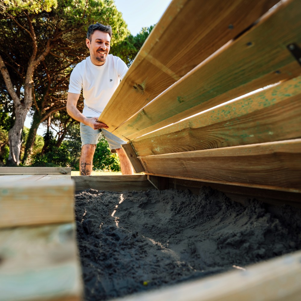 Holz ist ein lebendiges Material und kann sich durch Feuchtigkeit oder Temperatur leicht ausdehnen oder zusammenziehen. Deshalb empfehlen wir dir, das Holz direkt nach Erhalt auszupacken und es mindestens 2 Tage lang trocknen zu lassen, bevor du mit dem Aufbau beginnst. So kann die Restfeuchtigkeit aus dem Imprägnierungsprozess vollständig entweichen – und du stellst sicher, dass alle Teile optimal passen.